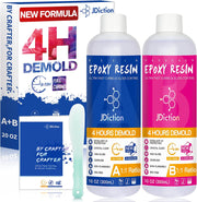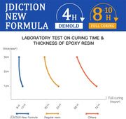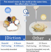 - ã� Hours Demold Upgrade Formulaã�Do you want your artwork completed quickly? ? JDiction 4 HOURS DEMOLD epoxy resin new formula is coming. Only 8-10 HOURS to FULL CURING, saves your time. You can create more works than others at the same time. This sounds so exciting!!! In order to keep your memory for the longterm, this epoxy resin also offer 2X UV YELLOWING PROTECTION. 2 IN 1 SCIENTIFIC FORMULA